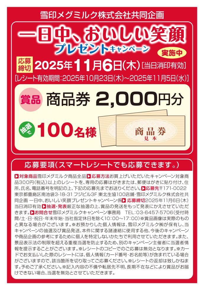 キャンペーン 商品券プレゼント【雪印メグミルク】一日中、 おいしい笑顔プレゼントキャンペーン ※レシート有効期間:2025年10月23日(木)~2025年11月5日(水)