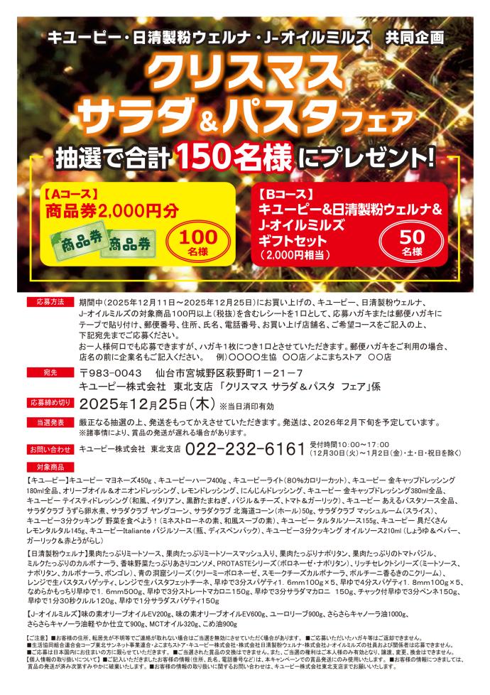 キャンペーン 商品券プレゼント【キユーピー・日清製粉ウエルナ・J-オイルミルズ】 クリスマス サラダ&パスタフェア