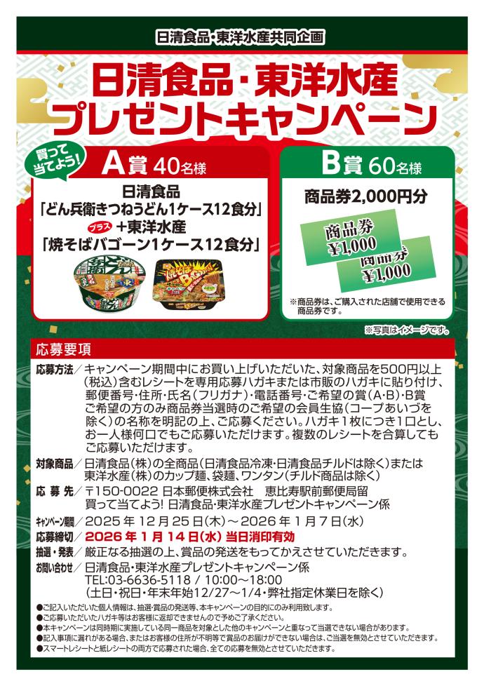 キャンペーン 商品券プレゼント【日清食品・東洋水産】プレゼントキャンペーン ※キャンペーン期間 2025年12月25日(木)~2026年1月7日(水)