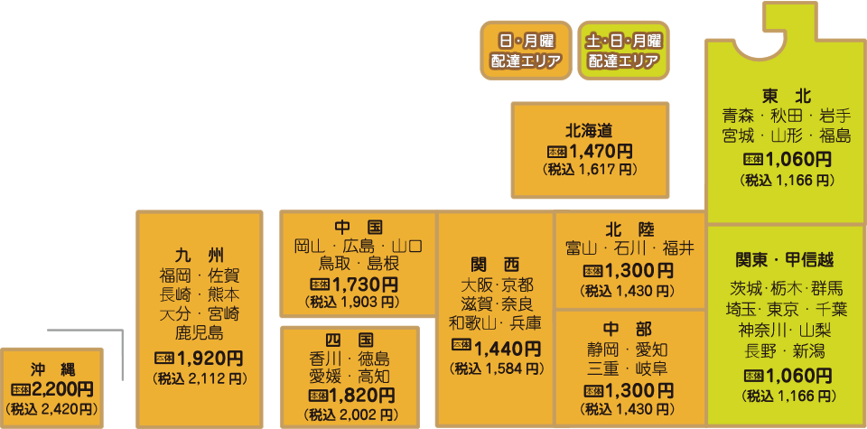 ※常温品と冷凍品は箱を分けて配達します。冷凍品は上記配達料の他に本体200円頂きます。